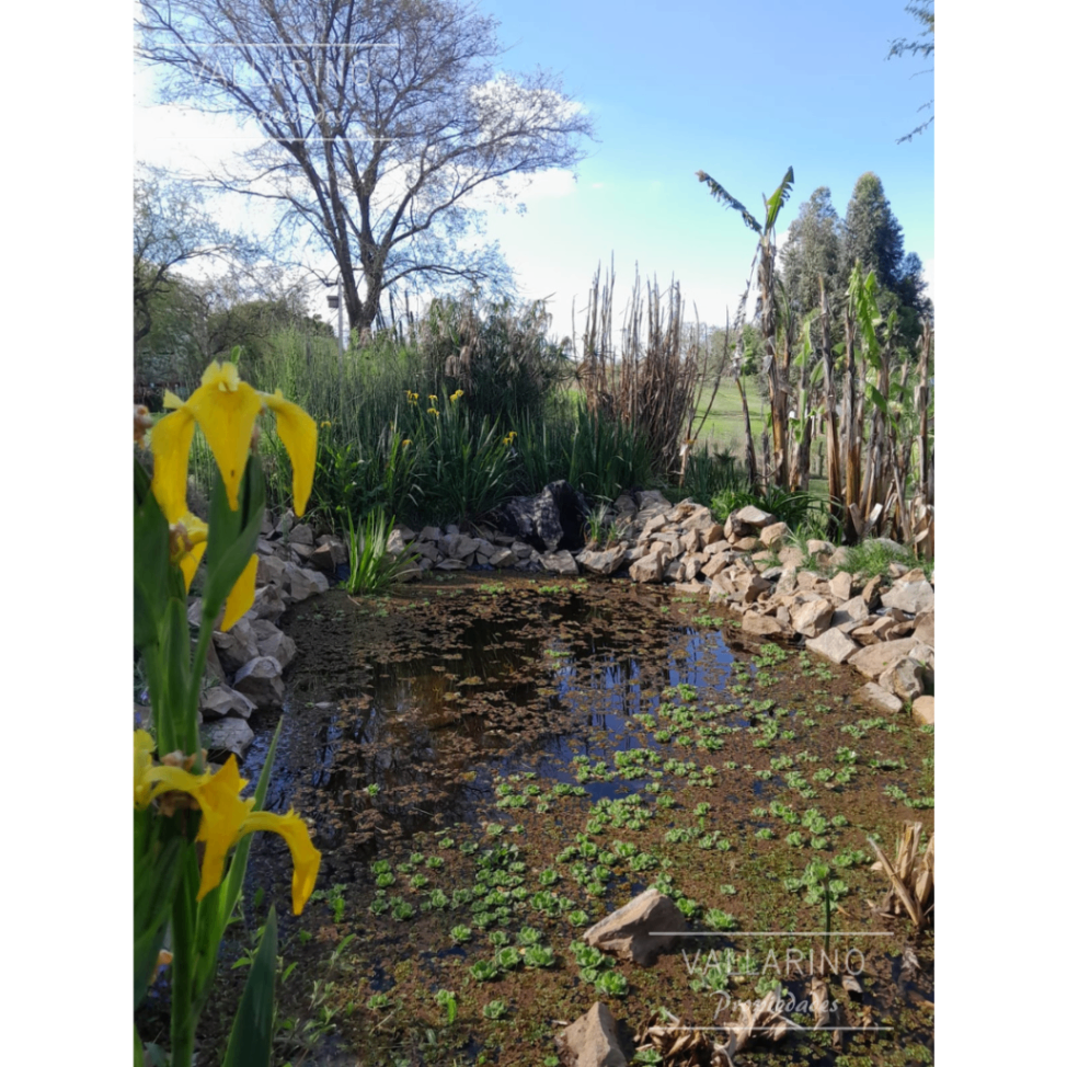 Amplio parque con arbolado y vegetación, laguna y un estanque con hermosas plantas junto a la casa.
